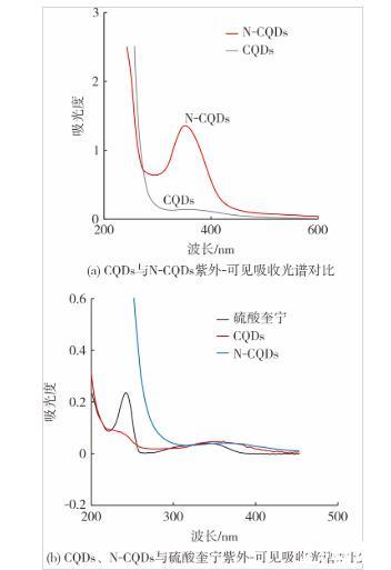 圖4(a)是CQDs與N-CQDs的紫外-可見吸收光譜。與CQDs的吸收光譜相比,N-CQDs在波長為350 nm處有一個(gè)明顯的吸收峰,這是酰胺基團(tuán)中的C=O的n→π躍遷所致,在長波段方向出現(xiàn)吸收帶。這也表明氮原子已被成功引入碳量子點(diǎn)中。圖4(b)是以參比法計(jì)算熒光量子產(chǎn)率CQDs和N-CQDs以及硫酸奎寧的紫外吸收光譜對比,從圖4(b)可以看出,三者吸光度在波長為300~400 nm區(qū)間內(nèi)基本接近,且數(shù)值上沒有超過0.05,滿足量子產(chǎn)率計(jì)算條件要求,可以此濃度為基礎(chǔ)計(jì)算熒光量子產(chǎn)率。