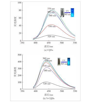 圖5 CQDs和N-CQDs在不同激發(fā)波長下的熒光發(fā)射光譜