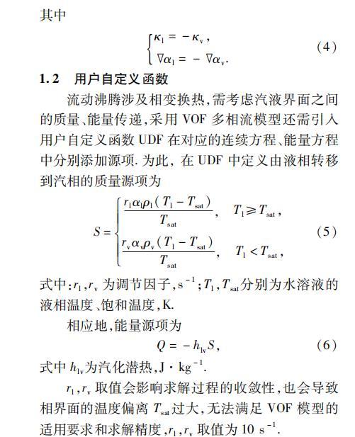 流動沸騰涉及相變換熱,需考慮汽液界面之間的質量、能量傳遞,采用VOF多相流模型還需引入用戶自定義函數UDF在對應的連續方程、能量方程中分別添加源項。為此,在UDF中定義由液相轉移到汽相的質量源項為