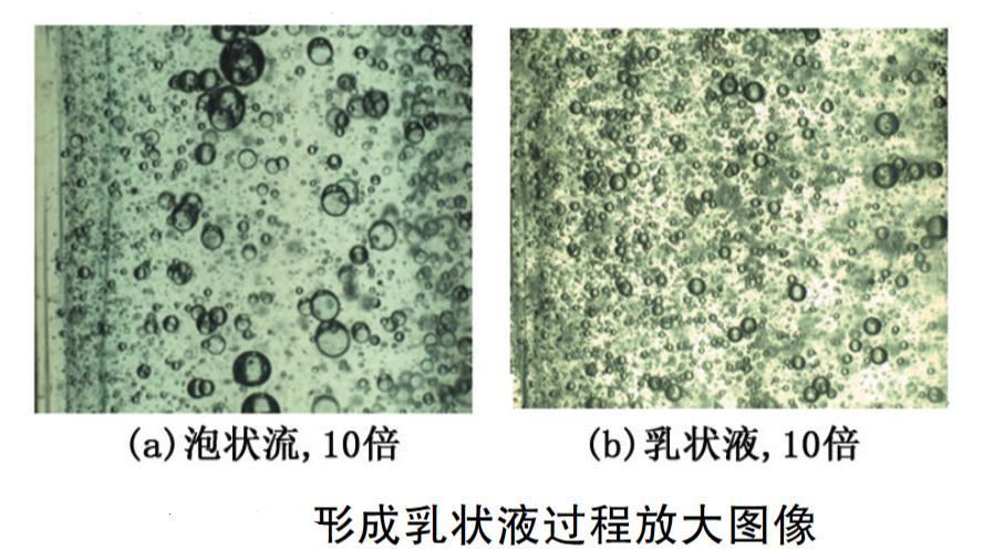 50%持水率的表面活性劑水溶液加入油相中后,先以連續的擾動流流動型態穿過油相;到2min時,連續的水相逐漸分散、溶解,油珠穿插在連續的水相中,形成更明顯的攪拌狀流動;3min時,水相繼續分散,水相與油相形成油水界面膜,此時泡狀流出現(水泡放大10倍圖像見圖5 (a));5min時,部分水相與油相形成水包油乳狀液,透光性變差,水相與形成的水包油乳狀液以環狀流的形式在垂直管道中上升流動;7min時,更多的水包油乳狀液形成,少部分水相分散在水包油乳狀液中;8min完全形成O/W乳狀液(10倍放大圖見圖5(b))。