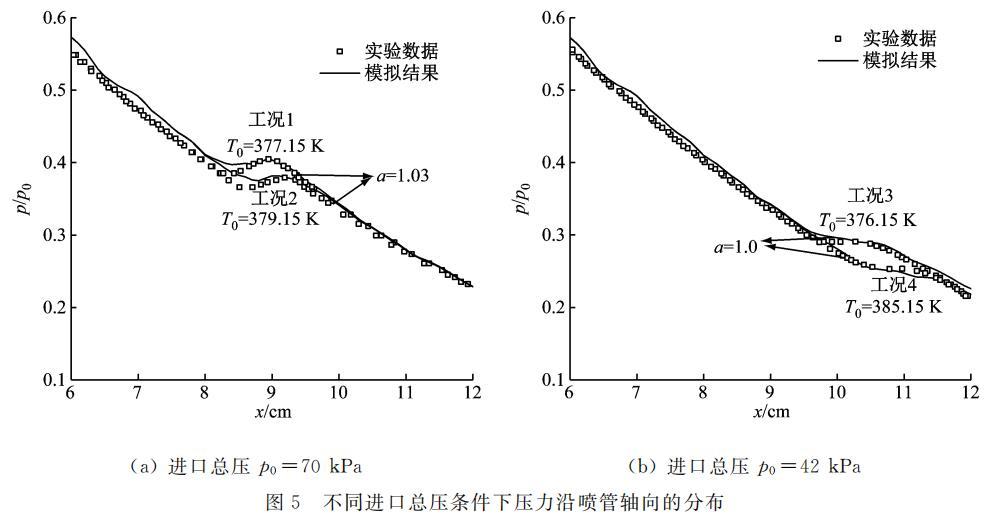 圖 5 給出了進(jìn)口總壓為 70 kPa 和 42 kPa 條件下,蒸汽壓力沿噴管的軸向分布。由圖 5(a) 可知,a=1.03 時(shí),工況 1、工況 2 模擬得出的壓力分布與實(shí)驗(yàn)數(shù)據(jù)基本吻合。與圖 5(a) 相似,圖 5(b) 中當(dāng) a=1.0 時(shí),均能獲得與實(shí)驗(yàn)壓力分布基本吻合的模擬結(jié)果。對(duì)比圖 5(a) 和圖 5(b) 可知,a 的取值與進(jìn)口總溫關(guān)聯(lián)較小,而與總壓有明顯的相關(guān)性。該結(jié)論從圖 6 中 2 組工況的壓力分布曲線可進(jìn)一步證實(shí)。在相同的進(jìn)口總溫下,隨著總壓的下降,對(duì)應(yīng)的表面張力修正系數(shù)最佳取值分別從 1.03 和 1.02 下降到 1.0。對(duì)于以上 7 個(gè)工況的預(yù)測,其蒸汽壓力陡升程度與實(shí)驗(yàn)數(shù)據(jù)相吻合,蒸汽凝結(jié)位置與實(shí)驗(yàn)數(shù)據(jù)的相對(duì)誤差也均小于 2%,在可接受范圍內(nèi)。