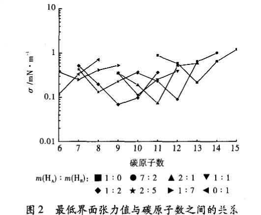 在測定直餾柴油與HA和HB的比值不同的表面活性劑體系間的界面張力時發現,HA與HB的比值為1:2時,油/水界面張力最低,因此可以判斷出直餾柴油的EACN值為9。