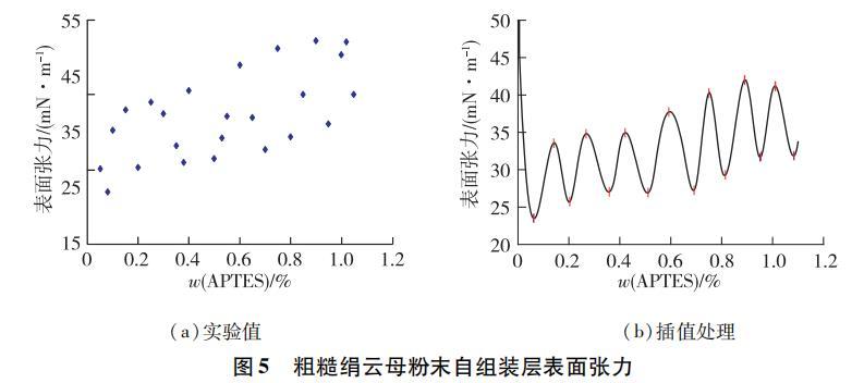 圖 5(a)為粗糙絹云母粉末在不同 APTES質量分數下的分子自組裝膜的表面張力,圖中的數據點表現出周期波動的特點。為了獲得該曲線的波峰和波谷,對圖5(a)進行插值處理。圖5(b)顯示在小于1.2%,曲線具有周期性,且波峰與波谷隨著 APTES用量的增加而增大。根據圖5(b),分別選取峰谷和峰尖的APTES用量及表面張力列入表2。