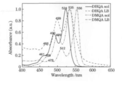 C16DMQA的LB膜吸收峰較C6DHQA進(jìn)一步紅移約15 nm,且吸收帶明顯寬化。這表明在C16DMQA的LB膜中,J-聚集體的形成更為充分,分子間的激子耦合作用更強(qiáng)。長(zhǎng)烷基鏈不僅增強(qiáng)了分子的疏水性,提高了在氣-液界面的穩(wěn)定性,更重要的是,它通過(guò)調(diào)節(jié)分子的空間位阻和堆積方式,促進(jìn)了分子間π-π相互作用的有效重疊,從而形成了更大尺寸或更有序的聚集體結(jié)構(gòu)。