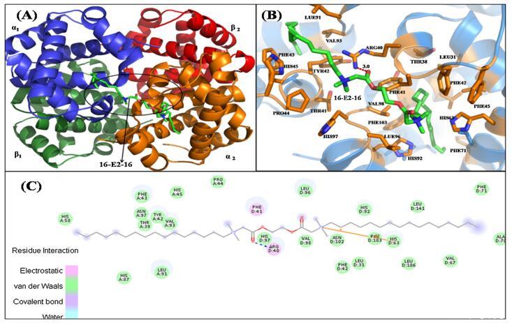 圖 6. 具有 16-E2-16 的 Hb 結(jié)構(gòu)示意圖。 (A) Hb-16-E2-16 的結(jié)構(gòu)。 Hb 的亞單位用不同的顏色表示。 配體 16-E2-16 是 以棍子為代表。 (B) 距停靠的 16-E2-16(綠色)5? 范圍內(nèi) Hb 的周?chē)被釟埢ǔ壬?(C) Hb/16-E2-16 相互作用的二維表示。 (為了 對(duì)圖例中顏色參考的解釋?zhuān)x者可參考本文的網(wǎng)絡(luò)版本。)