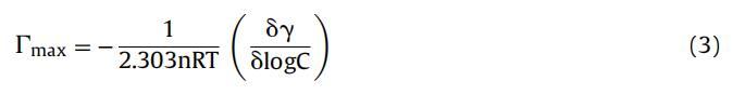 最大表面過(guò)量 (∫max) 表示為每單位面積界面處的表面活性劑分子濃度。 表面張力數(shù)據(jù)用于計(jì)算表面過(guò)量 應(yīng)用吉布斯吸附等溫線(xiàn)的濃度 (∫max) 方程:
