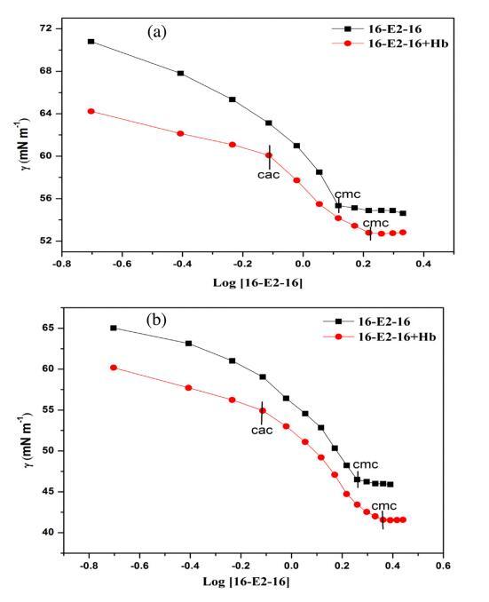 圖 1. 16-E2-16/Hb 在不同溫度下的表面張力。 (a) 298.15K (b) 308.15K (c) 318.15K。 [Hb] = 5 μM。