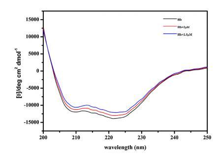 進(jìn)行CD以進(jìn)一步確認(rèn)構(gòu)象變化 由 16-E2-16 引起的 Hb,從而允許進(jìn)一步評(píng)估 Hb 和 16-E2-16 之間的相互作用。 圖 5 顯示了 不存在和存在 16-E2-16 時(shí) Hb 的 CD 光譜。 光盤(pán) Hb 的光譜在 208 nm 和 222 nm 處顯示兩個(gè)負(fù)最小值, 蛋白質(zhì)α-螺旋結(jié)構(gòu)的特征。 16-E2-16 光學(xué)不活動(dòng)不顯示任何信號(hào)。 在場(chǎng) 在 16-E2-16 中,Hb 的負(fù)橢圓度降低,表明 可能形成 Hb/16-E2-16 復(fù)合物 [68]。 α-螺旋 計(jì)算了 Hb 及其與 16-E2-16 (2 μM) 復(fù)合物的百分比,發(fā)現(xiàn)分別為 53% 和 47%。 進(jìn)一步降低 在更高濃度的 16-E2-16 (2.5 μM) 存在下達(dá)到 44% 表明 Hb 的 α-螺旋含量明顯降低。 因此, CD 結(jié)果表明存在 16-E2-16 變化 Hb 的二級(jí)結(jié)構(gòu)與我們的 計(jì)算結(jié)果。