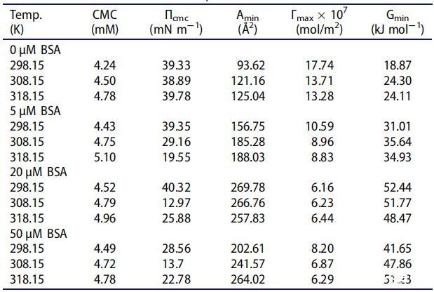 Gs min的值與形成的表面或表面活性的穩(wěn)定性成反比。在所有實(shí)驗(yàn)溫度下,所有系統(tǒng)獲得的Gmin值都較低(表1)。Gmin的較低值表明將形成熱力學(xué)上更穩(wěn)定的表面。這表明穩(wěn)定的表面形成和分子間的良好相互作用 [C10-4-C10im]Br2和BSA。[78]