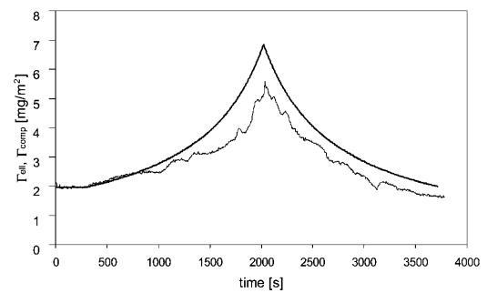 圖8代表性壓縮-吸附b-乳球蛋白(c=0.01 wt%)的膨脹實(shí)驗(yàn),壓縮低于每個(gè)分子的面積。 通過擴(kuò)散量和壓縮量(Gcomp)和橢偏儀(Gell)測量的預(yù)期吸附量。