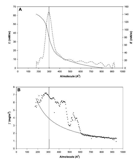 圖3 HFBII的代表性壓縮等溫線,壓縮量遠(yuǎn)低于每個(gè)分子的面積。 (A) P(-)和E(---)與每個(gè)分子的面積的關(guān)系。 (B) 攤鋪量和壓縮(Gcomp,-)預(yù)期的表面載荷,并通過橢偏儀(Gell,A)測量。