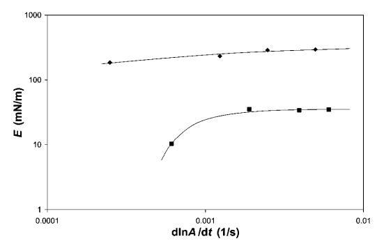 頻率依賴性。 為了評估其中一些系統(tǒng)中粘性損失的重要性,我們對b-lg和HFBII進(jìn)行了頻率相關(guān)的表面膨脹流變。 對于表面膨脹流變學(xué),我們顯示了在18<P<22 mN m-1之間測量的小變形模量(見圖10)。 注意,變形率d(lna)/dt為0.0012 s 1對應(yīng)于5 mm min 1的勢壘速度,用于大變形實(shí)驗(yàn)。 相比之下,歧化時(shí)間約為0.5小時(shí),接近泡沫實(shí)驗(yàn)觀察到的粗化時(shí)間。 HFBII的數(shù)據(jù)表明,在所研究的變形速率范圍內(nèi),變形速率對E的影響適中。 對于b-乳球蛋白,頻率的影響更為明顯,因此,在變形速率低于0.001 s 1時(shí),可觀察到E的強(qiáng)烈下降。 這表明b-lg的粘性損失比HFBII更為明顯。 這一比較再次表明,b-lg的外觀更柔軟,壓縮/膨脹時(shí)解吸/吸附能力更強(qiáng)。