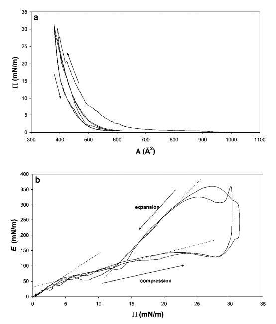 藜蘆皂甙。奎拉葉皂苷的壓縮曲線如圖6所示。該皂甙在拐點(diǎn)處顯示出非常高的表面壓力,最大表面壓力為45 mN m-1。此外,皂甙表現(xiàn)出很寬的遲滯回線。從E–P曲線推斷出斜率為4.3,觀察到E中出現(xiàn)2個(gè)平滑的峰,這可能表明界面中存在相變,從皂甙的相對拉長的疏水區(qū)域判斷。27當(dāng)屏障方向逆轉(zhuǎn)時(shí),觀察到E中存在較大的超調(diào),表明膜破裂,類似于HFBII。