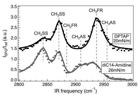 圖6。diC14 amdine在26 mN/m(灰色)下的SFG光譜(點)和DPTAP(黑色)在20 mN/m下的SFG光譜(點)。垂直線表示亞甲基對稱拉伸(CH2SS)、甲基對稱拉伸(CH3SS)、亞甲基非對稱拉伸費米共振(CH2FR)、亞甲基非對稱拉伸(CH2AS)的位置,甲基對稱拉伸費米共振(CH3FR)和甲基不對稱拉伸(CH3AS)。為清晰起見,DPTAP頻譜偏移。實體曲線使用洛倫茲模型擬合數據。