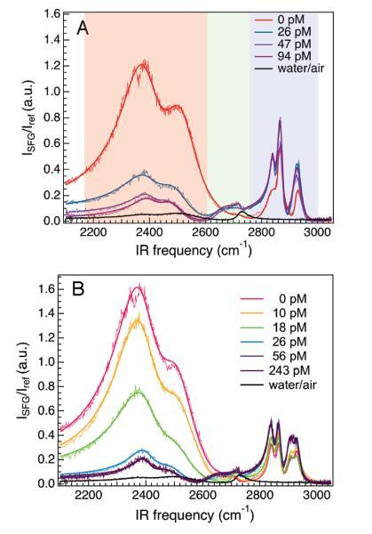 界面水的光譜響應。圖2顯示了在2100-3100 cm-1范圍內,隨著亞相DNA濃度的增加,DPTAP、diC14氨基和DPPC單分子膜的VSF光譜。對這些數據的粗略檢查顯示出幾個特征。聚焦于圖2面板A,從低頻向高頻移動,很明顯,有一個巨大的雙峰結構,隨著DNA的加入,其振幅突然降低(透明的紅色矩形);一個小的、更高頻率的峰值(以≈2675 cm-1),隨著DNA(透明綠色矩形)的加入而增加;在2800-2950 cm-1的頻率范圍內有幾個較窄的峰值(這些峰值是CH拉伸振動的結果,顯示在一個透明的藍色矩形中,下面將進一步討論)。