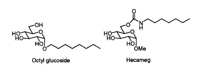 我們的第一個(gè)驚喜是發(fā)現(xiàn)A系列海藻糖雙子座不溶于水。例如,A-12、A-14和A-16(指鏈長的數(shù)字)在1毫升溫水中旋轉(zhuǎn)2毫克時(shí)會留下沉淀物。即使在70°C的溫度下,A-10也會在這種處理過程中形成渾濁的懸浮液。A-8在室溫下的可溶濃度僅為1-2 mM(根據(jù)動態(tài)光散射,在該濃度下,會形成膠束大小的聚集體)。天真地說,人們可能會認(rèn)為a-8的溶解度大得多,因?yàn)樵摲肿佑闪鶄€(gè)羥基和兩個(gè)酰胺組成。盡管相關(guān)的6-氨基-6-脫氧己糖衍生物需要加熱才能溶解,25許多烷基化單糖(例如,辛基葡萄糖苷和甲基6-O-(N-庚基羰基)-R-D-吡喃葡萄糖苷或下面的“Hecameg”)是水溶性的。然而,A-8并沒有類似的天賦。這里的教訓(xùn)是,用一句老生常談的話來說,我們的雙子座比其各個(gè)部分的總和要多(或少)。不管老生常談與否,雙子座的獨(dú)特屬性都取決于它。