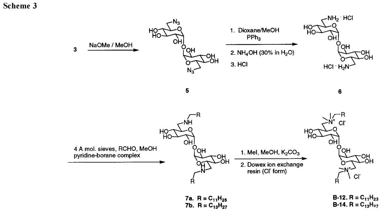 方案2和方案3以及實(shí)驗(yàn)部分詳述了我們獲得A系列和B系列海藻糖雙子的方法。另外幾條評論有助于美化這一信息。B型海藻糖雙子最明顯的先驗(yàn)途徑是用長鏈?zhǔn)灏分苯尤〈?的甲苯磺酰化基團(tuán)。盡管沿著這些路線進(jìn)行了多次嘗試,但只獲得了分解產(chǎn)物或起始材料。然而,如方案2所示,我們成功地用疊氮化合物取代了2的兩個(gè)甲苯磺酰化物,得到了3。此處采用文獻(xiàn)程序28,但出于安全考慮,HMPA被DMPU取代作為溶劑。然后,雙疊氮化物3經(jīng)過Staudinger反應(yīng)25,29,在一個(gè)步驟中得到長鏈雙酰胺4a-g,而該長鏈雙酰胺4a-g只需脫保護(hù)即可獲得a系列雙子。在方案3中,脫保護(hù)糖5的疊氮化物還原將化合物轉(zhuǎn)化為二伯胺鹽酸鹽6。長鏈醛與6和吡啶硼烷絡(luò)合物30的還原胺化得到海藻糖衍生物7。使用NaBH3-CN作為還原劑,該反應(yīng)的產(chǎn)率很低。在用甲基碘化物將7甲基化,然后進(jìn)行離子交換(以促進(jìn)純化和提高溶解性)之后,我們得到了B系列海藻糖雙子。
