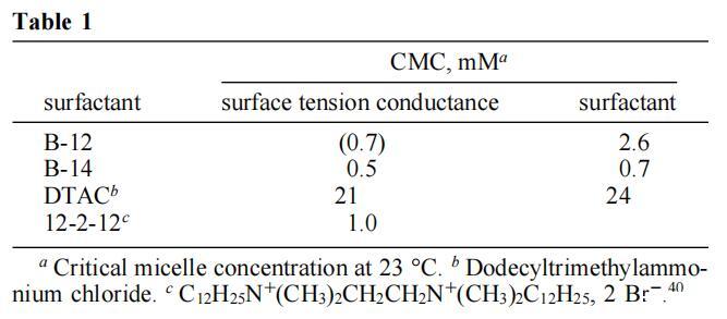 B-12和B-14確實(shí)是水溶性化合物,在臨界膠束濃度(CMC)以上形成膠束,動態(tài)光散射顯示顆粒大小小于5nm。CMC值是通過表面張力-濃度曲線(圖4)和電導(dǎo)率-濃度曲線(圖5)中的斷裂來確定的。38表1給出了結(jié)果數(shù)據(jù)(以及兩種常規(guī)表面活性劑的數(shù)據(jù),用于比較)。如圖所示,B-12的CMC值通過張力測量法和電導(dǎo)測量法(這兩種方法都是可重復(fù)的)得出的結(jié)果不一致。這種差異至少部分可以追溯到B-12表面張力的時(shí)間依賴性。因此,在10分鐘的過程中,B-12水溶液的表面壓力增加了10 mN/m,之后趨于穩(wěn)定。這種動態(tài)表面張力過程(之前已經(jīng)用雙子座表面活性劑觀察到)13,15,39可能與雙子座表面活性劑在空氣/水界面組織方面的困難有關(guān)。為了解決這個(gè)問題,圖4中的B-12溶液在表面張力測量之前老化20分鐘,從而減少了系統(tǒng)尚未平衡的可能性。盡管采取了這種預(yù)防措施,但我們無法確定依賴時(shí)間的界面重組是否不會影響B(tài)-12圖,并導(dǎo)致基于張量和電導(dǎo)的數(shù)據(jù)之間的差異。當(dāng)然,后者來源于不受界面事件影響的大塊特性,因此更可靠。有趣的是,B-14沒有表現(xiàn)出隨時(shí)間變化的表面張力,兩種方法確定的CMC值是合理一致的。也許更長的鏈既增強(qiáng)了對空氣/水界面的親和力,也增強(qiáng)了從溶液中吸收界面的動力學(xué)。