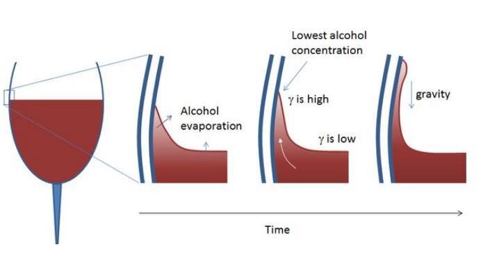 水由于強(qiáng)有力的氫鍵的存在,使得其表面張力極強(qiáng)。正是由于表面張力的存在,因此葡萄酒和杯壁交界處有一個(gè)薄薄的彎月面,它的存在加上表面乙醇的蒸發(fā),使得此處水的占比較大,因此具有較大的表面張力。而酒內(nèi)部的乙醇濃度較高,表面張力較小,因此與彎月面處形成了一個(gè)表面張力梯度,從而內(nèi)部的酒逐漸向彎月面移動(dòng),彎月面處的酒逐漸變多,逐步形成一個(gè)個(gè)小酒滴。但當(dāng)酒滴大到一定程度時(shí),由于重力作用,它便會(huì)滴下來,這就是“酒淚”現(xiàn)象了。