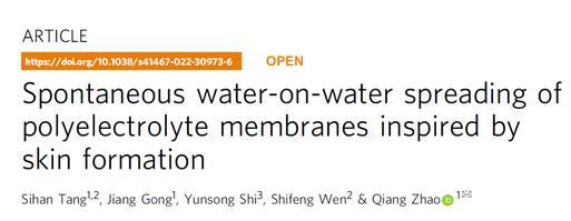 近期,趙強教授課題組在《Nature Communications》在線刊發了該領域的新進展(Spontaneous water-on-water spreading of polyelectrolyte membranes inspired by skin formation,Nat.Commun.13,3227,2022.),提出了一種聚電解質水溶液在水面自發鋪展,形成多孔膜的機制。文章第一作者是化學與化工學院2020屆碩士畢業生湯思晗,合作單位包括華中科技大學材料科學與工程學院,協和醫院。研究得到國家自然科學基金,國家重點研發計劃和三峽實驗室開放基金的支持。