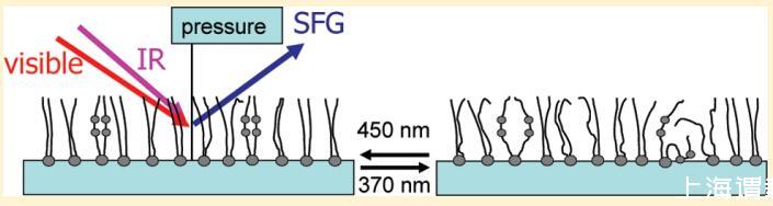在此,我們研究了光開關脂質DT Azo-5P(圖1)的單分子膜,該單分子膜是純的,并與脂質1,2-二棕櫚酰-sn-甘油-3-磷酸膽堿(DPPC)混合。如圖1中的紫外/可見光譜所示,光活性脂質可分別在370 nm和450 nm的光照下從其反式狀態切換到順式狀態并返回。我們將表面壓力測量與無標簽、寬帶振動和頻產生(VSFG)光譜相結合。這些技術使我們能夠研究空氣-水界面上的脂質分子單層。可以獲得有關脂類與水分子相互作用的信息以及脂類的分子結構。在非線性光學技術VSFG中,紅外(IR)光束和可見光(VIS)光束在界面處組合,產生具有兩個入射光束和頻率的信號。如果紅外與分子振動共振,信號就會強烈增強。研究表明,這種通過分子振動的技術可以提供有關脂類分子構象和取向的信息。11-18和頻產生在中心對稱介質中是被禁止的,因為它是一個二階非線性光學過程。19因此,該技術對中心對稱材料(例如水表面)的最外表面分子層敏感。相反,缺少信號表明界面上的材料或分子基團是中心對稱的。對于金表面偶氮苯功能化的自組裝單分子膜,SFG在確定光異構化的截面和機理方面非常有用。得出的結論是,光異構化是由直接電子激發驅動的,類似于液相中的偶氮苯。3我們將表明,通過切換光脂,可以可逆地控制脂質的表面壓力和分子順序。在同時含有光脂和脂質DPPC的混合單分子膜中,我們可以通過光學切換偶氮苯基脂質來控制DPPC的順序。這為體外控制脂質-脂質相互作用提供了一種新的手段。