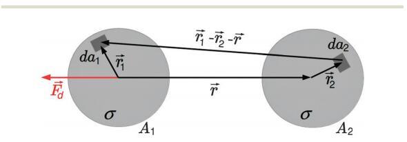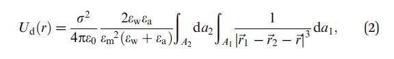 其中Ai表示域i的面積,dai表示其面積元素,-ri表示其相對于域中心的位置向量,i=1,2-r是從域1中心到域2中心的向量,如圖1所示。e0是真空介電常數(shù),ew和ea分別是水和空氣的相對介電常數(shù)。在這里,我們使用了Urbakh等人21的研究結果,該研究描述了由兩個半無限介質包圍的薄電介質層中偶極子之間的相互作用。