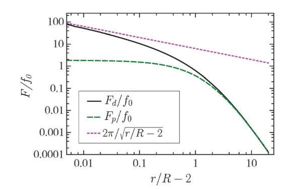 圖2顯示了兩個半徑相等的圓形區(qū)域的Fd(r)(實線)和Fp(r)(虛線)。疊加在等式(4)的數(shù)值解上,我們添加了等式(5)(虛線)的短距離的漸近表達式。注意,當兩個域接近接觸(r=2R)時,F(xiàn)d發(fā)散,而Fp保持有限。此外,對于實驗感興趣的范圍2R o r o 10R,兩個力之間的差異是可觀的。特別是,即使r=5R,差值也在15%左右。