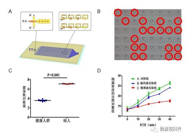 圖3A.液滴微流控芯片原理設計圖結構包含上游的液滴生成區和下游的液滴捕獲區;B.利用液滴熒光成像分辨細菌陽性和陰性液滴;C.液滴數字化分析顯示健康人和尿路感染病人尿液細菌計數差別;D.液滴數字化分析顯示敏感和耐藥細菌對于抗生素的反應。