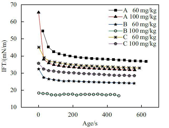 為了充分證明時間效應(yīng)對懸滴法測定結(jié)果會造成影響,實驗使用懸滴法對A,B,C三種表面活性劑復(fù)配溶液較稀含量下的動態(tài)表面張力進行了研究。結(jié)果如圖3所示。