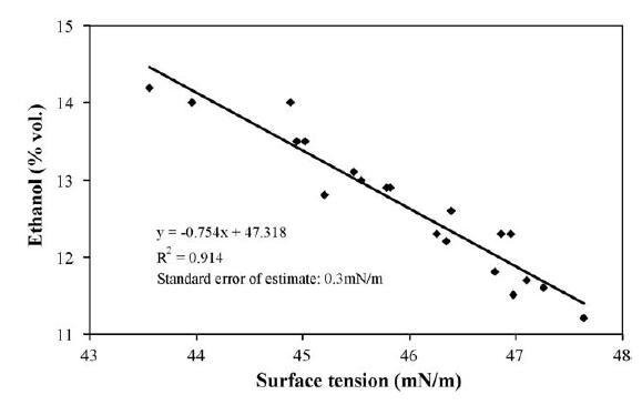 檢測到乙醇、蛋白質和單寧對水性、水醇和模型葡萄酒標準溶液的表面張力有顯著影響,以及上述基質之間的重要變化后,我們認為繼續對真實葡萄酒樣品進行研究很有趣。 我們的目標是評估盡可能多的其他葡萄酒化合物對表面張力的影響,獲得統計相關性,最后,基于對葡萄酒表面張力的簡單測量,獲得基本釀酒參數值的預測模型。