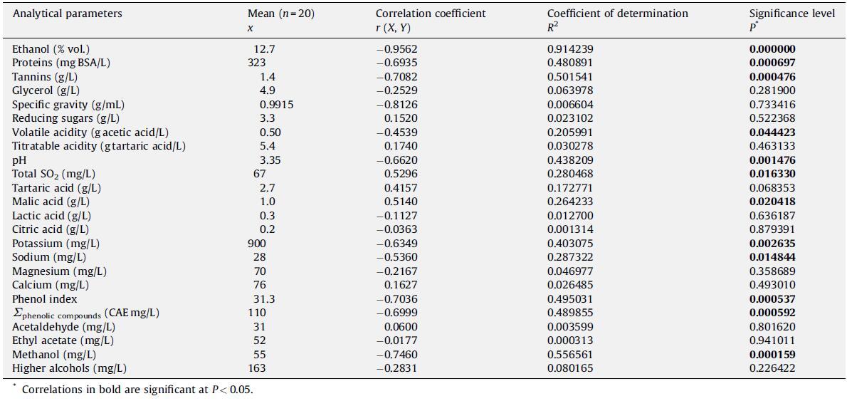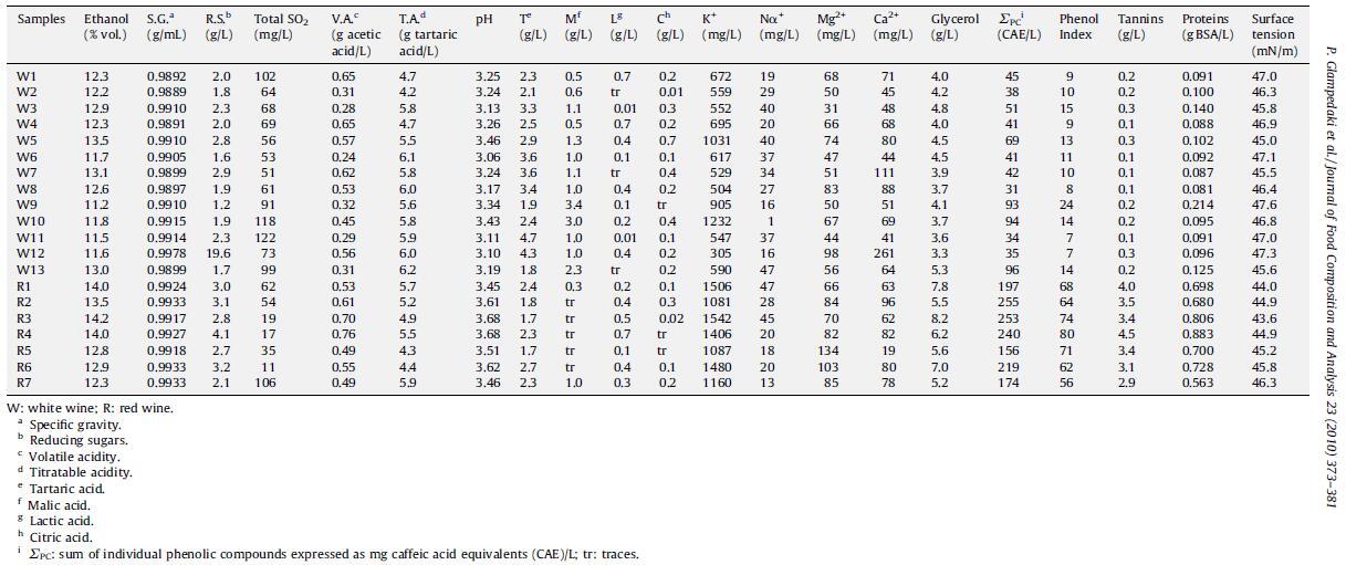 為此,對 20 種靜止、白色和紅色希臘單品種葡萄酒樣品進行了常規釀酒學參數(乙醇含量、比重、還原糖、可滴定酸度、揮發性酸度、總 SO2 和 pH 值)和表面張力的測定。 還進行了使用 HPLC 測定有機酸(酒石酸、蘋果酸、乳酸和檸檬酸)、陽離子(鉀、鈉、鎂和鈣)、甘油和酚類化合物以及使用氣相色譜法測定揮發性化合物的基本儀器分析。 最后,采用光譜法進行總酚指數、單寧和蛋白質測定。 結果如表 2 和表 3 所示。關于蛋白質測定,可能影響所有樣品的系統分析誤差可視為不影響最終值,因為所研究的葡萄酒具有相似的乙醇含量。 此外,在葡萄酒樣品中加入已知量的標準 BSA 溶液進行的分析未發現對蛋白質測定有任何干擾(數據未顯示)。 上述數據與表面張力的相關性分析結果如表4所示。