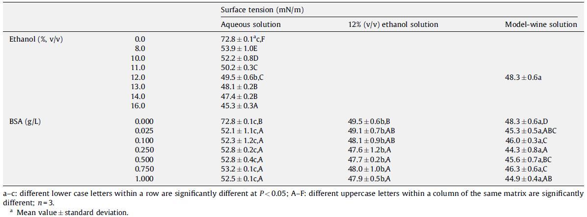 表 1 乙醇和 BSA 標準溶液在水、水/乙醇混合物(12%,v/v 乙醇)和模型葡萄酒溶液(12%,v/v 乙醇,2 g/L 酒石酸,pH 3.5)中的表面張力值25歲。