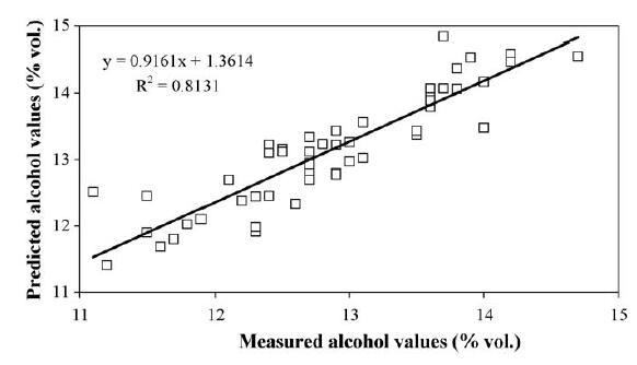 為了測試乙醇預測模型,我們分析了第二組 30 個葡萄酒樣品。 所提出的線性模型預測的值與葡萄酒酒精度等級的測量值的圖如圖 3 所示。更新的模型解釋了 81.3% 的乙醇含量變化,而現在估計的標準誤差為 0.36 % (v/v)。 盡管必須進一步優化,但該統計工具為文獻中現有的那些提供了一種額外的方法,用于簡單快速地估計靜止葡萄酒的酒精等級(Rocchia 等,2007a,b)。