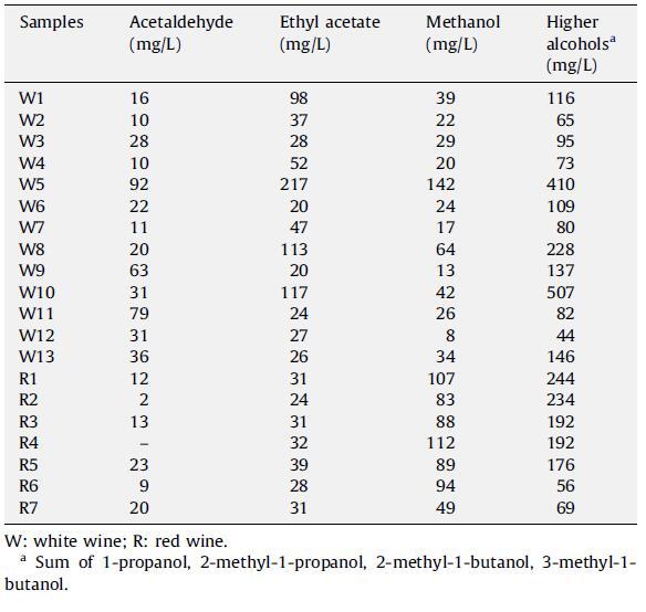 表 3 在 20 個葡萄酒樣品中測定的揮發性化合物濃度的平均值。