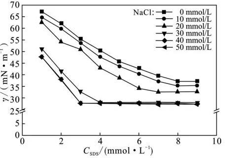 這是由于當無機鹽添加濃度未達上限值時,由于反離子的加入可以降低表面活性離子之間的靜電斥力,而無機鹽濃度越高,反離子濃度越大,導致表面活性離子之間的靜電斥力降低程度越大,從而使得表面張力越小,如圖1所示。而當超過無機鹽添加濃度上限時,表面張力達到穩(wěn)定,其可能的原因是反離子和表面活性劑分子在有限數(shù)量空位的表面已達近飽和狀態(tài),導致靜電斥力的降低程度達到最大。