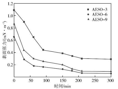由圖1可以看出,隨著測試時間的推移,脂肪醇聚醚磺酸鹽與煤油之的界面張力逐漸減小并趨于穩(wěn)定。3種表面活性劑界面張力隨聚合的增大先減小后增大,其中AESO-3界面張力值最大,AESO-6界面張力值最小為6.03×10-2mN/m。