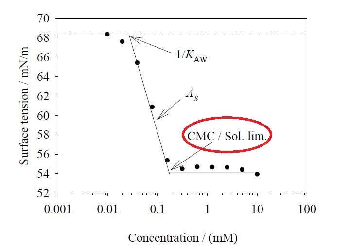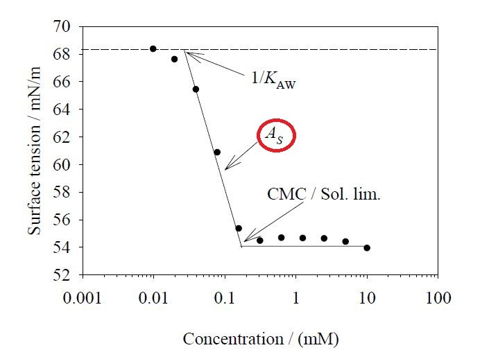 化合物分子定向和折疊決定了極性和非極性基團之間的對抗和平衡,通過真正表面積TSA(=每個吸附分子的平均面積)來反映。表面積來源于吸附等溫線,即在表面飽和的表面過剩濃度(最大吸附值)。
